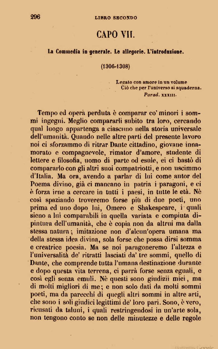 Tempo ed opera perduta è comparar co' minori i sommi ingegni. Meglio compararli subito tra loro| cercando qual luogo appartenga a ciascuno nella storia universale dell'umanità. Quando nelle altre parti del presente lavoro noi ci sforzammo di ritrar Dante cittadino| giovane innamorato e compagnevole| rimator d'amore| studente di lettere e filosofia| uomo di parte od esule| ei ci bastò di compararlo con gli altri suoi compatriotti| e non uscimmo d'Italia. Ma ora| avendo a parlar di lui come autor del Poema divino| già ci mancano in patria i paragoni| e ci è forza irne a cercare in tutti i paesi| in tutte le età. Nè così spaziando troveremo forse più di due poeti| uno prima ed uno dopo Ini| Omero e Shakespeare| i quali sieno a lui comparabili in quella variata e compiuta dipintura dell'umanità| che è copia non da altrui ma dalla stessa natura ; imitazione non d'alcun'opera umana ma della stessa idea divina| sola forse che possa dirsi somma e creatrice poesia. Ma se noi paragoneremo l'altezza e l'universalità de' ritratti lasciati da' tre sommi| quello di Dante| che comprende tutta l'umana destinazione durante e dopo questa vita terrena| ci parrà forse senza eguali| e così egli senza emuli. Nè questi sono giudizii miei| ma di molti migliori di me; e non solo dati da molti sommi poeti| ma da parecchi di quegli altri sommi in altre arti| che sono i soli giudici legittimi dé' loro pari. Sono| è vero| ricusati da taluni| i quali restringendosi in un'arte sola| non tengono conto se non delle minutezze e delle regole