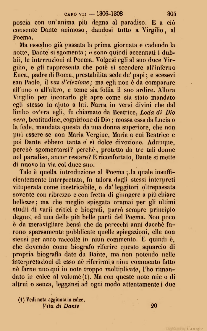 Tale è quella introduzione al Poema ;.la quale insufficientemente interpretata| fu talora dagli stessi interpreti vituperata come inestricabile| e da' leggitori oltrepassata sovente con ribrezzo e con fretta di giungere a più chiare bellezze; ma che meglio spiegata oramai per gli ultimi studii di varii critici e biografi| parrà sempre principio degno| ed una delle più belle parti del Poema. Non poco è da meravigliare bensì che da parecchi anni dacché furono sparsamente pubblicate quelle spiegazioni| elle non siensi per anco raccolte in niurj commento. E quindi è| che dovendo come biografo riferire questo squarcio di propria biografia dato da Dante| ma non potendo nelle interpretazioni di esso nè riferirmi a niun commento fatto nò farne uno qui in note troppo moltiplicate| l'ho rimandato in calce al volumé(l). Ma con queste note mie o di altrui o senza| leggansi ad ogni modo attentamente i duo