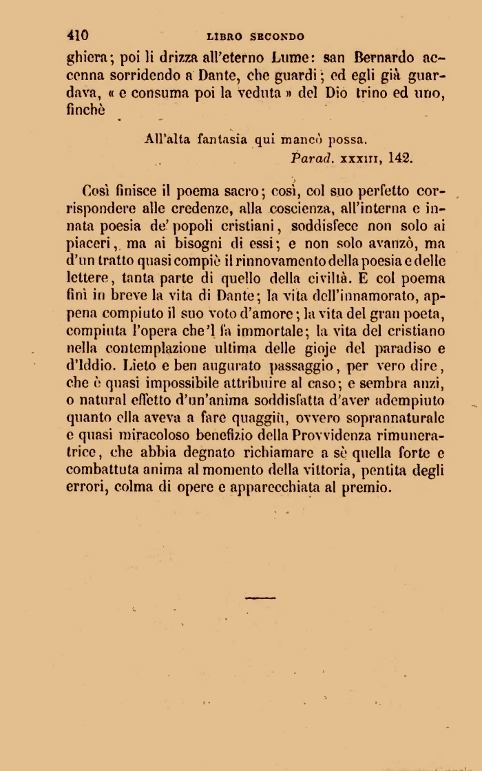 Così finisce il poema sacro; così| col suo perfetto corrispondere alle credenze| alla coscienza| all'interna e innata poesia de' popoli cristiani| soddisfece non solo ai piaceri|| ma ai bisogni di essi; e non solo avanzò| ma d'un tratto quasi compiè il rinnovamento della poesia e delle lettere| tanta parte di quello della civiltà. E col poema finì in breve la vita di Dante; la vita dell'innamorato| appena compiuto il suo voto d'amore ; la vita del gran poeta| compiuta l'opera che'l fa immortale; la vita del cristiano nella contemplazione ultima delle gioje del paradiso e d'Iddio. Lieto e ben augurato passaggio| per vero dire| che è quasi impossibile attribuire al caso; e sembra anzi| o naturai effetto d'un'anima soddisfatta d'aver adempiuto quanto ella aveva a fare quaggiù| ovvero soprannaturale e quasi miracoloso benefizio della Provvidenza rimunera-trice| che abbia degnato richiamare a sè quella forte e combattuta anima al momento della vittoria| pentita degli errori| colma di opere e apparecchiata al premio.