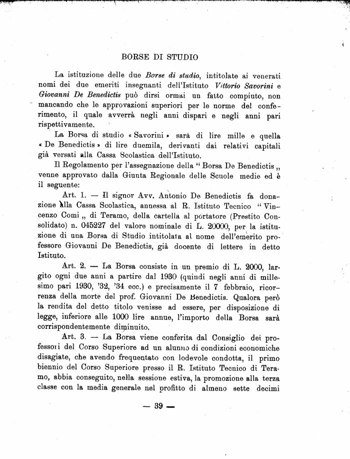 La istituzione delle due Borse di studio, intitolate ai venerati nomi dei due emeriti insegnanti dell'Istituto Vittorio Savorini e Giovanni De Benedictis può dirsi ormai un fatto compiuto, non mancando che le approvazioni superiori per le norme del conferimento, il quale avverrà negli anni dispari e negli anni pari rispettivamente.