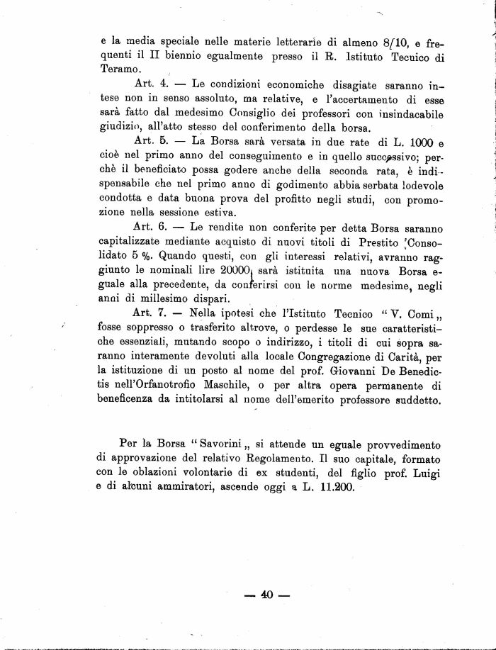 Per la Borsa . Savorini „ si attende un eguale provvedimento di approvazione del relativo Regolamento. Il suo capitale, formato con le oblazioni volontarie di ex studenti, del figlio prof. Luigi e di al'cuni ammiratori, ascende oggi a L. 11.200.