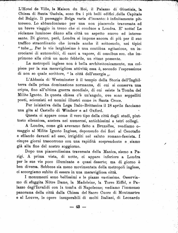 A Londra, come già avevamo fatto a Bruxelles, rendiamo o-raaggio al Milite Ignoto Inglese, deponendo dei fiori al Cenotafio e sfilando davanti ad esso, irrigiditi nel saluto romano-fascista. I cinque giorni trascorrono con una rapidità sosprendonte e . siamo già alla fine del nostro soggiorno.