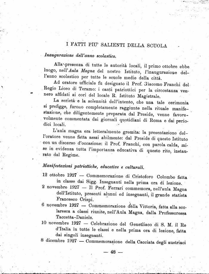 2 novembre 1927 — II Prof. Ferrari commemora, nell'aula Magna dell'Istituto, presenti alunni ed insegnanti, il grande statista Francesco Crispi.