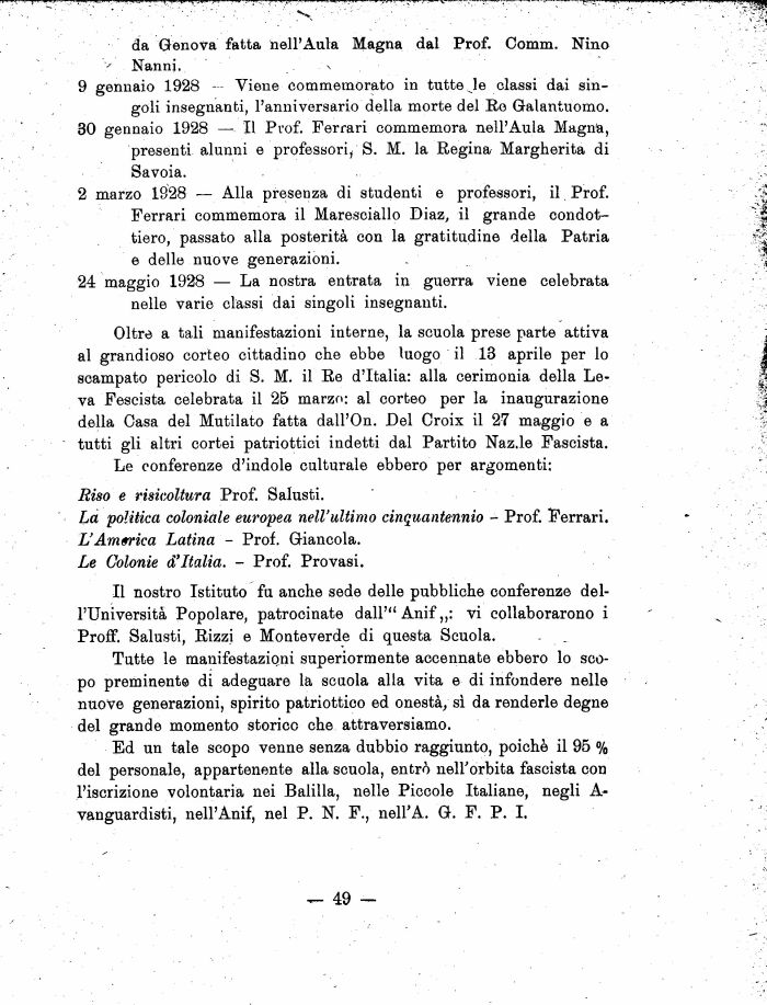 Ed un tale scopo venne senza dubbio raggiunto, poiché il 95 % del personale, appartenente alla scuola, entrò nell'orbita fascista con l'iscrizione volontaria nei Balilla, nelle Piccole Italiane, negli A-vanguardisti, nell'Anif, nel P. N. F., nell'A. G. F. P. I.