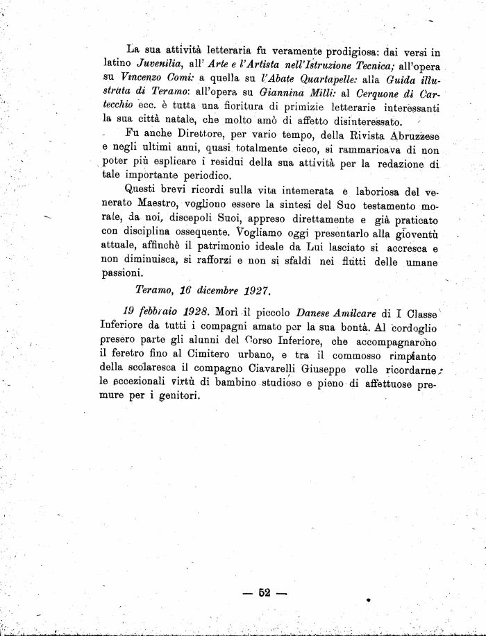 19 febbraio 1928. Morì il piccolo Danese Amilcare di I Classe Inferiore da tutti i compagni amato por la sua bontà. Al cordoglio presero parte gli alunni del Oorso Inferiore, che accompagnarono il feretro fino al Cimitero urbano, e tra il commosso rimpianto della scolaresca il compagno Ciavarelli Giuseppe volle ricordarne; le eccezionali virtù di bambino studioso e pieno di affettuose premure per i genitori.