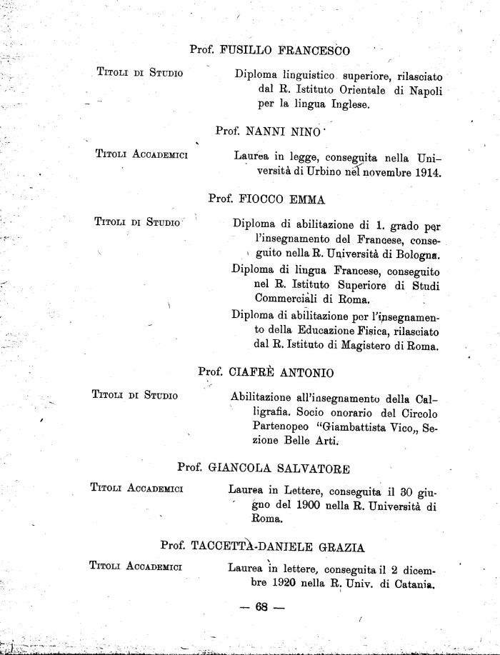 Laurea in lettere, conseguita il 2 dicembre 1920 nella R. Univ. di Catania.