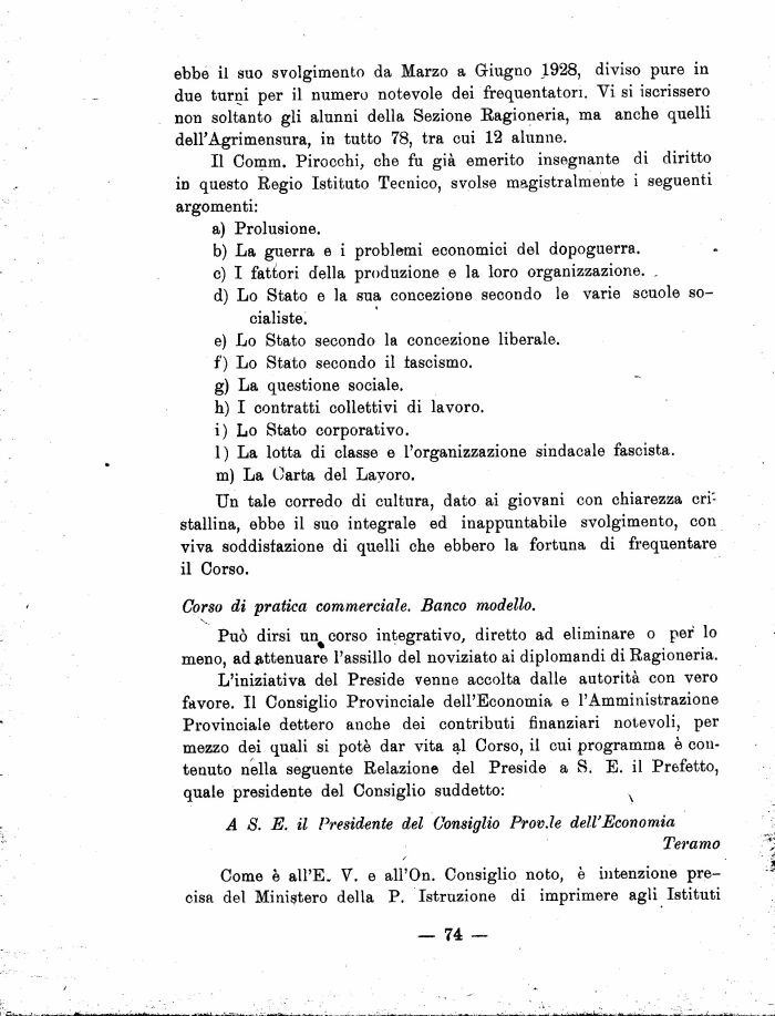 L'iniziativa del Preside venne accolta dalle autorità con vero favore. Il Consiglio Provinciale dell'Economia e l'Amministrazione Provinciale dettero anche dei contributi finanziari notevoli, per mezzo dei quali si potè dar vita al Corso, il cui programma è contenuto nella seguente Relazione del Preside a S. E. il Prefetto, quale presidente del Consiglio suddetto: