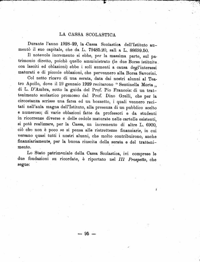 Col netto ricavo di una serata, data dai nostri alunni al Teatro Apollo, dove il 19 gennaio 1929 recitarono . Sentinella Morta „ di L. D'Ambra, sotto la guida del Prof. Pio Francois: di un trattenimento scolastico promosso dal Prof. Dino G-relli, che per la circostanza scrisse una farsa ed un bozzetto, i quali vennero recitati nell'aula magna dell'Istituto, alla presenza di un pubblico scelto e numeroso; di varie oblazioni fatte da professori e da studenti in ricorrenze diverse e delle cedole maturate nelle cartelle esistenti, si potè realizzare, per la Cassa, un incremento di altre L. 6900, ciò cb/j non è poco se si pensa alle ristrettezze finanziarie, in cui versano quasi tutti i nostri alunni, che molto contribuirono, anche finanziariamente, per la buona riuscita della serata e del trattenimento.
