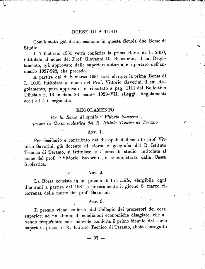 Per desiderio e contributo dei discepoli dell'emerito prof. Vittorio Savorini, già docente di storia e geografia del R. Istituto Tecnico di Teramo, si istituisce una borsa di studio, intitolata al nome del prof. . Vittorio Savorini „ e amministrata dalla Cassa Scolastica.