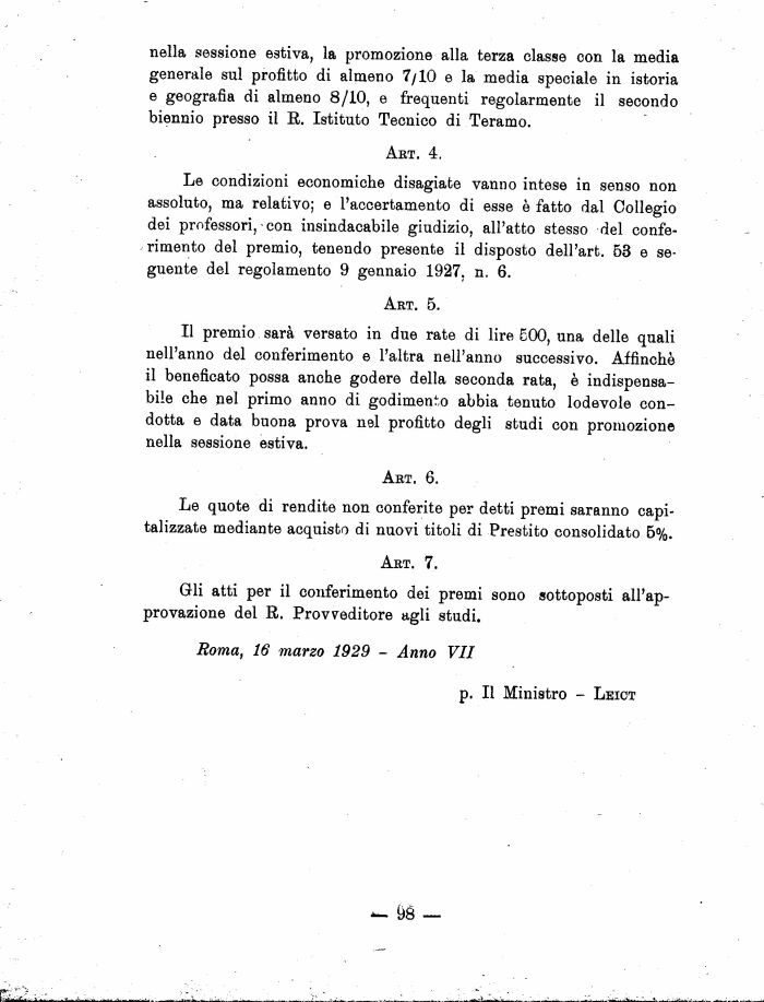 nella sessione estiva, la promozione alla terza classe con la media generale sul profitto di almeno 7/10 e la media speciale in istoria e geografia di almeno 8/10, e frequenti regolarmente il secondo biennio presso il R. Istituto Tecnico di Teramo.
