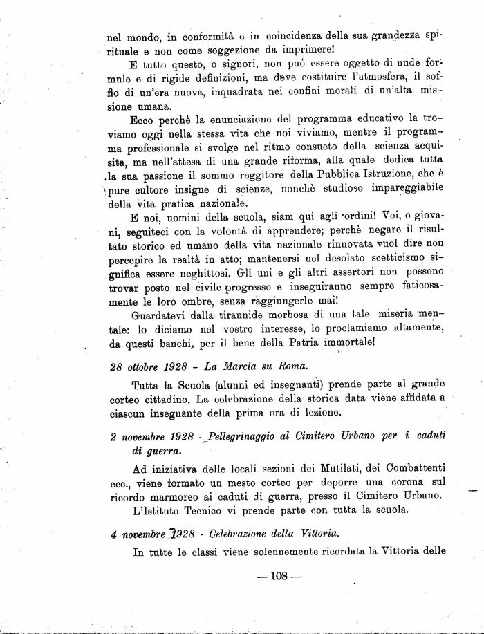 E noi, uomini della scuola, siam qui agli 'ordini! Voi, o giovani, seguiteci con la volontà di apprendere; perché negare il risultato storico ed umano della vita nazionale rinnovata vuoi dire non percepire la realtà in atto; mantenersi nel desolato scetticismo significa essere neghittosi. Gli uni e gli altri assertori non possono trovar posto nel civile progresso e inseguiranno sempre faticosamente le loro ombre, senza raggiungerle mai!