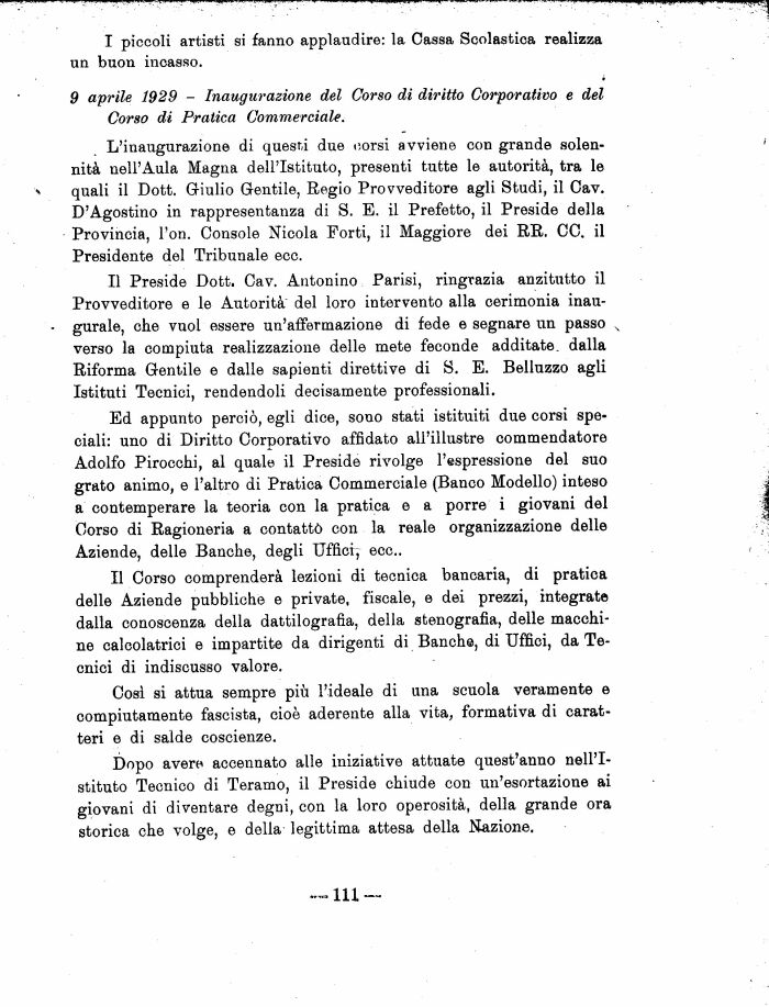 Ed appunto perciò, egli dice, sono stati istituiti due corsi speciali: uno di Diritto Corporativo affidato all'illustre commendatore Adolfo Pirocchi, al quale il Preside rivolge l'espressione del suo grato animo, e l'altro di Pratica Commerciale (Banco Modello) inteso a contemperare la teoria con la pratica e a porre i giovani del Corso di Ragioneria a contattò con la reale organizzazione delle Aziende, delle Banche, degli Uffici, eco.,
