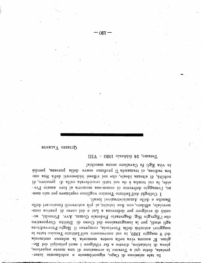 In tale missione di Capo, signorilmeute e nobilmente interpretata, dette qui a Teramo.la sensazione di una mente superiore, piena di iniziative, dirette a far rifulgere i sacri principii del Regime. E' ancora viva nella nostra memoria la solenne cerimonia del 9 maggio 1929, in cui convennero nell'Istituto Tecnico tutte le maggiori autorità della Provincia, compreso il Regio-Provveditore agli studi, per la inaugurazione del Coi'so di Diritto Corporativo che l'Egregio Sig. Segretario Federale Comm. Avv. Pirocchi, accettò di svolgere per deferenza a Lui e del corso di pratica commerciale, affidato, con fine intuito, ai più autorevoli funzionar} delle Banche e delle Amministrazioni locali.
