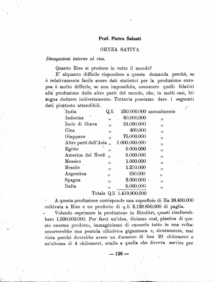 A questa produzione corrisponde una superficie di Ha 28.400.000 coltivata a Riso e un prodotto di q.li 2.129.850.000 di paglia. * Volendo esprimere la produzione in Ettolitri, questi risulterebbero 1.500.000.000. Per farci un'idea, diciamo cosμ, plastica di questo enorme prodotto, immaginiamo di cuocerlo tutto in una volta: occorrerebbe mia pentola cilindrica gigantesca e, sicuramente, mai vista perchι dovrebbe avere un diametro di ben 20 chilometri e un'altezza di 4 chilometri, simile a quella che doveva servire per