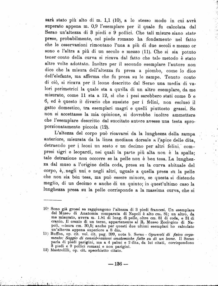 11) Buffon, op. cit. voi. cit. pag. 399, nota h. Serao- Opuscoli di fisico argomento: Saggio di consid'razioni anatomiche fatte su di un leone. 11 Serao parla di piedi parigini, ma a 4 palmi e '2 dita, da lui citati, corrispondono 3 piedi e 9 pollici romani e non parigini.