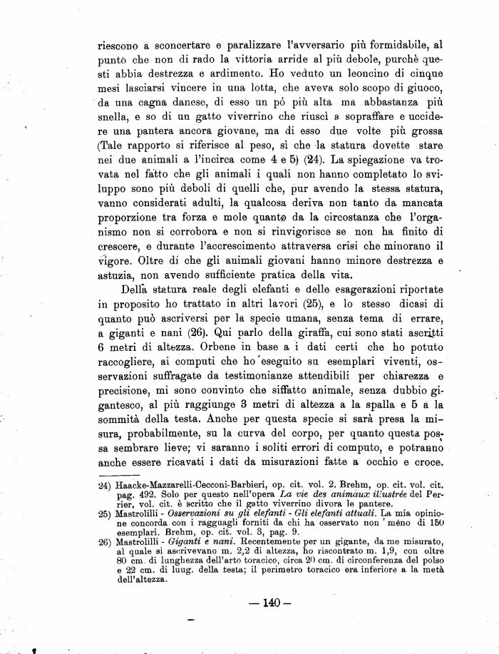 Della statura reale degli elefanti e delle esagerazioni riportate in proposito ho trattato in altri lavori (25), e lo stesso dicasi di quanto può ascriversi per la specie umana, senza tema di errare, a giganti e nani (26). Qui parlo della giraffa, cui sono stati ascritti 6 metri di altezza. Orbene in base a i dati certi che ho potuto raccogliere, ai computi che ho'eseguito su esemplari viventi, osservazioni suffragate da testimonianze attendibili per chiarezza e precisione, mi sono convinto che siffatto animale, senza dubbio gigantesco, al più raggiunge 3 metri di altezza a la spalla e 5 a la sommità della testa. Anche per questa specie si sarà presa la misura, probabilmente, su la curva del corpo, per quanto questa possa sembrare lieve; vi saranno i soliti errori di computo, e potranno anche essere ricavati i dati da misurazioni fatte a occhio e croce.