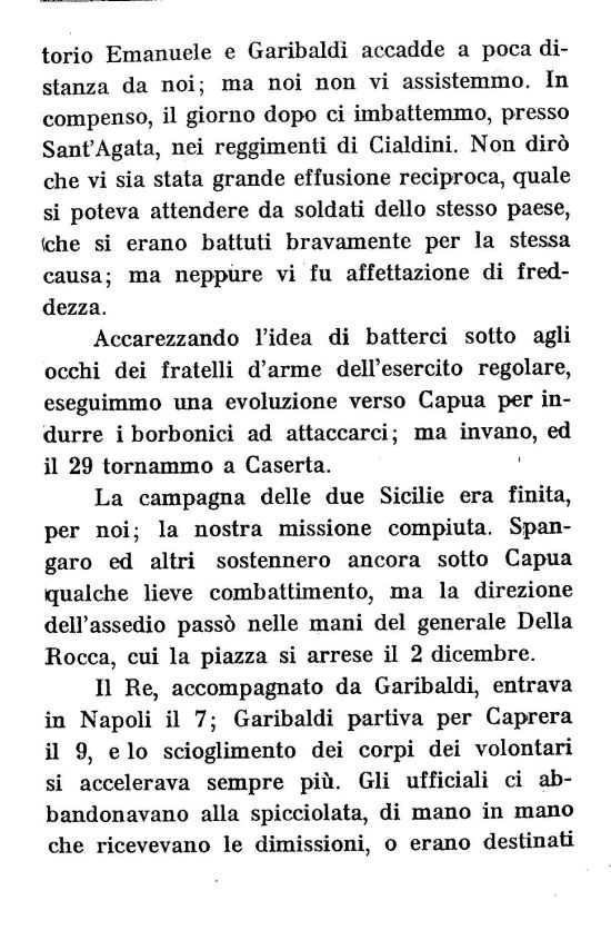 La campagna delle due Sicilie era finita, per noi; la nostra missione compiuta. Span-garo ed altri sostennero ancora sotto Capua qualche lieve combattimento, ma la direzione dell'assedio passò nelle mani del generale Della Rocca, cui la piazza si arrese il 2 dicembre.