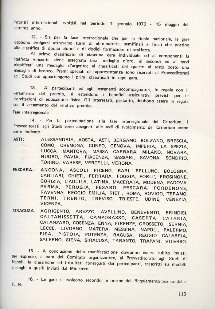 12. - Sia per fa fase interregionale che per la finale nazionale, le gare debbono svolgersi attraverso turni di eliminatorie, semifinali e finali che portino alla classifica di dodjci alunni e di dodici formazioni di staffetta.