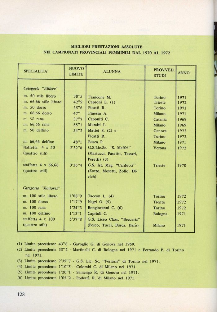 MIGLIORI PRESTAZIONI ASSOLUTE NEI CAMPIONATI PROVINCIALI FEMMINILI DAL 1970 AL 1972