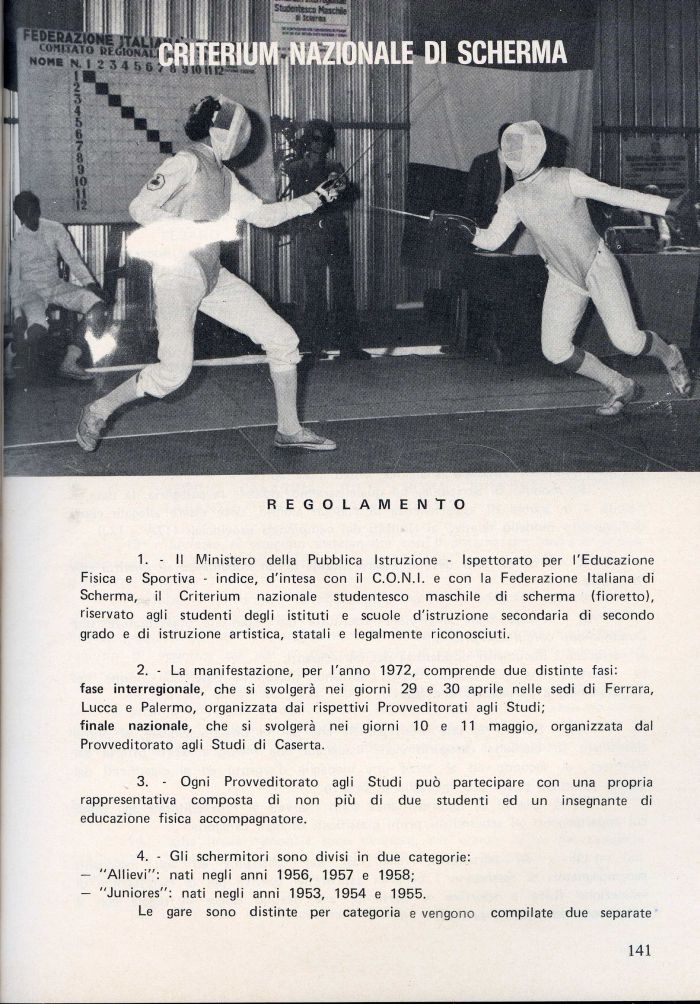 1. - Il Ministero della Pubblica Istruzione - Ispettorato per l'Educazione Fisica e Sportiva - indice, d'intesa con il C.O.N.I. e con la Federazione Italiana di Scherma, il Criterium nazionale studentesco maschile di scherma (fioretto), riservato agli studenti degli istituti e scuole d'istruzione secondaria di secondo grado e di istruzione artistica, statali e legalmente riconosciuti.