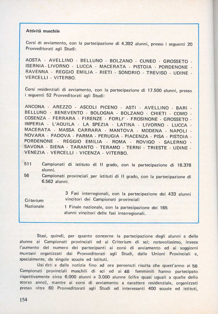 Dai dati e dalle notizie fino ad ora pervenuti risulta che quest'anno ai 56 Campionati provinciali maschili di sci ed ai 48 femminili hanno partecipato rispettivamente circa 6.000 alunni e 3.000 alunne (cifre quasi uguali a quelle dello scorso anno), mentre ai corsi di avviamento a carattere residenziale, organizzati presso oltre 60 Provveditorati agli Studi ed interessanti 400 scuole ed istituti.