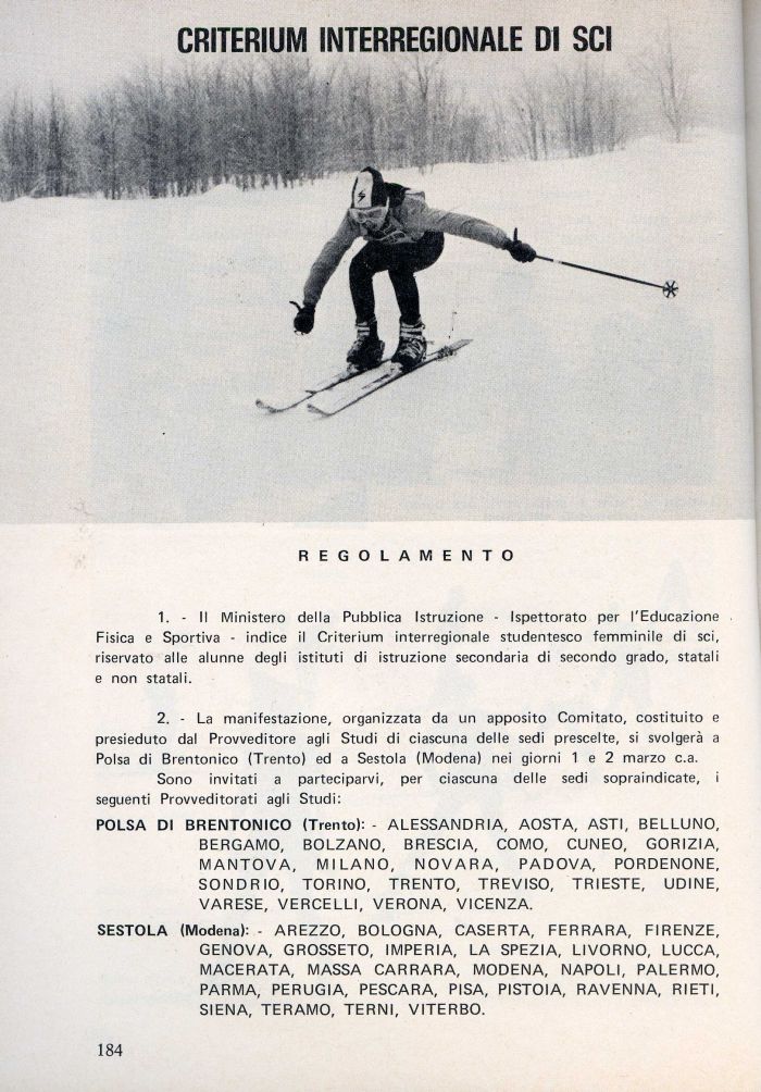1. - Il Ministero della Pubblica Istruzione - Ispettorato per l'Educazione Fisica e Sportiva - indice il Criterium interregionale studentesco femminile di sci, riservato alle alunne degli istituti di istruzione secondaria di secondo grado, statali e non statali.
