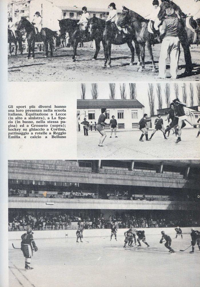 Gli sport pił diversi hanno una loro presenza nella scuola italiana. Equitazione a Lecce (in alto a sinistra), a La Spezia (in basso, nella stessa pagina) ed a Grosseto (sopra); hockey su ghiaccio a Cortina, pattinaggio a rotelle a Reggio Emilia e calcio a Belluno