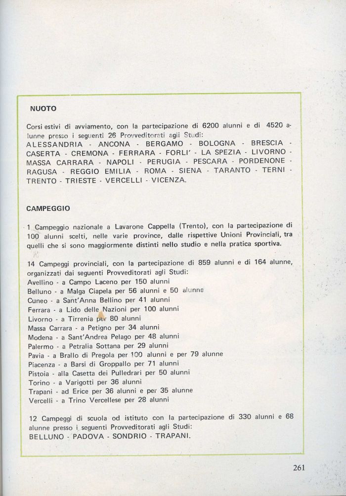 1 Campeggio nazionale a Lavarone Cappella (Trento), con la partecipazione di 100 alunni scelti, nelle varie province, dalle rispettive Unioni Provinciali, tra quelli che si sono maggiormente distinti nello studio e nella pratica sportiva.