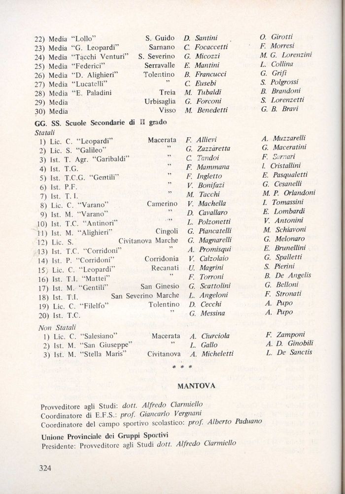Provveditore agli Studi: dott. Alfredo Ciarmiello Coordinatore di E.F.S.: prof. Giancarlo Vergnani Coordinatore del campo sportivo scolastico: prof. Alberto Paduano