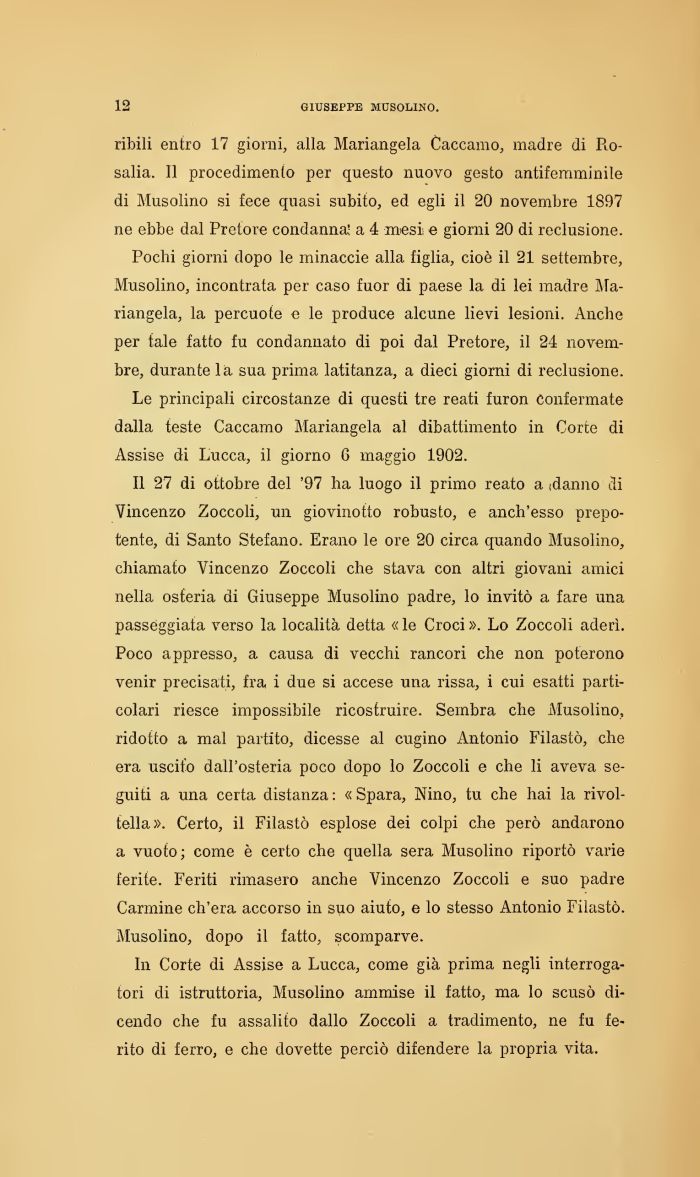 Il 27 di ottobre del '97 ha luogo il primo reato a idanno eli Vincenzo Zoccoli, un giovinotto robusto, e anch'esso prepotente, di Santo Stefano. Erano le ore 20 circa quando Musolino, chiamato Vincenzo Zoccoli che stava con altri giovani amici nella osteria di Giuseppe Musolino padre, lo invitò a fare una passeggiata verso la località detta « le Croci ». Lo Zoccoli aderì. Poco appresso, a causa di vecchi rancori che non poterono venir precisati, fra i due si accese una rissa, i cui esatti particolari riesce impossibile ricostruire. Sembra che Musolino, ridotto a mal partito, dicesse al cugino Antonio Filastò, che era uscito dall'osteria poco dopo lo Zoccoli e che li aveva seguiti a una certa distanza : « Spara, Nino, tu che hai la rivoltella». Certo, il Filastò esplose dei colpi che però andarono a vuoto; come è certo che quella sera Musolino riportò varie ferite. Feriti rimasero anche Vincenzo Zoccoli e suo padre Carmine ch'era accorso in suo aiuto, e lo stesso Antonio Filastò. Musolino, dopo il fatto, scomparve.