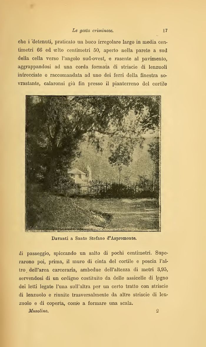 che i 'detenuti, praticato un buco irregolare largo in media centimetri 66 ed alto centimetri 50, aperto nella parete a sud della cella verso l'angolo sud-ovest, e rasente al pavimento, aggrappandosi ad una corda formata di striscie di lenzuoli intrecciate e raccomandata ad uno dei ferri della finestra sovrastante, calaronsi gił fin presso il pianterreno del cortile