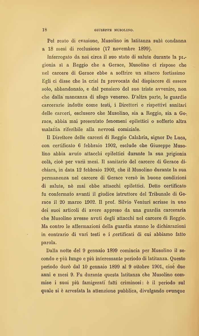 Il Direttore delle carceri di Reggio Calabria, signor De Luca, con certificato 6 febbraio 1902, esclude che Giuseppe Muso-lino abbia avuto attacchi epilettici durante la sua prigionia colà, cioè per varii mesi. Il sanitario del carcere di Gerace dichiara, in data 12 febbraio 1902, che il Musolino durante la sua permanenza nel carcere di Gerace versò in buone condizioni di salute, nè mai ebbe attacchi epilettici. Detto certificato fu confermato avanti il giudice istruttore del Tribunale di Gerace il 20 marzo 1902. Il prof. Silvio Venturi scrisse in uno dei suoi articoli di avere appreso da una guardia carceraria che Musolino avesse avuti degli attacchi nel carcere di Reggio. Ma contro le affermazioni della guardia stanno le dichiarazioni in contrario di vari testi e i .certificati di cui abbiamo fatto parola.