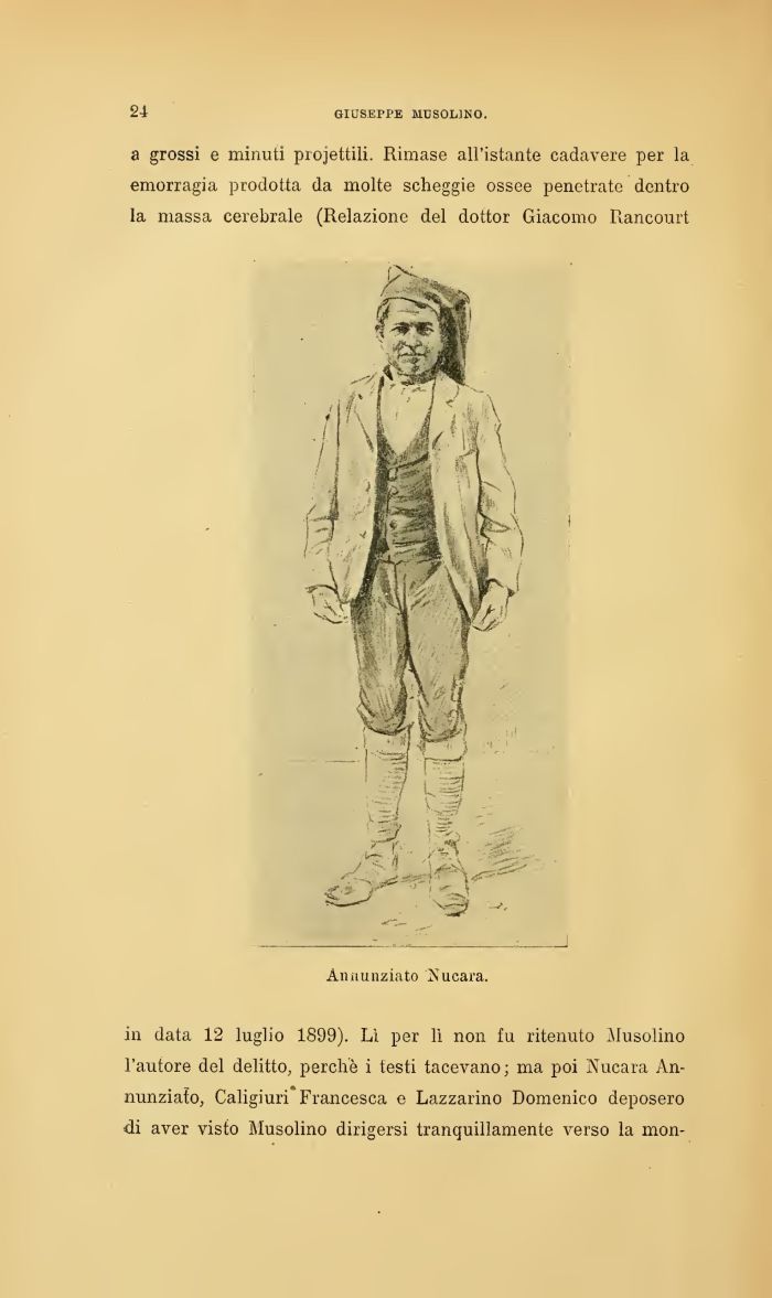in data 12 luglio 1899). Lì per lì non fu ritenuto Musolino l'autore del delitto, perchè i testi tacevano; ma poi Nucara Annunziato, Caligiuri* Francesca e Lazzarino Domenico deposero di aver visto Musolino dirigersi tranquillamente verso la mon-