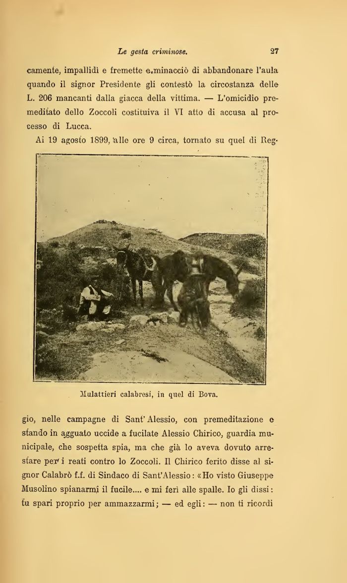 gio, nelle campagne di Sant'Alessio, con premeditazione e stando in agguato uccide a fucilate Alessio Chirico, guardia municipale, che sospetta spia, ma che già lo aveva dovuto arrestare per' i reati contro lo Zoccoli. Il Chirico ferito disse al signor Calabro f.f. di Sindaco di Sant'Alessio : « Ho visto Giuseppe Musolino spianarmi il fucile.... e mi ferì alle spalle. Io gli dissi : tu spari proprio per ammazzarmi ; — ed egli : — non ti ricordi