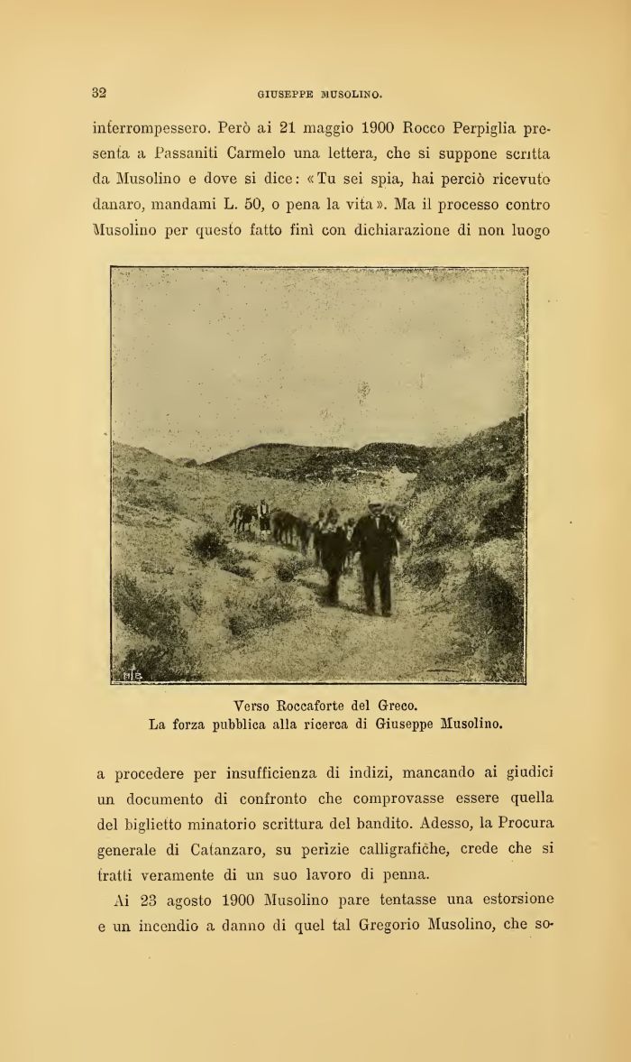 interrompessero. Però ai 21 maggio 1900 Rocco Perpiglia presenta a Passaniti Carmelo una lettera, che si suppone scritta da Musolino e dove si dice: «Tu sei spia, hai perciò ricevuto danaro, mandami L. 50, o pena la vita ». Ma il processo contro Musolino per questo fatto finì con dichiarazione di non luogo