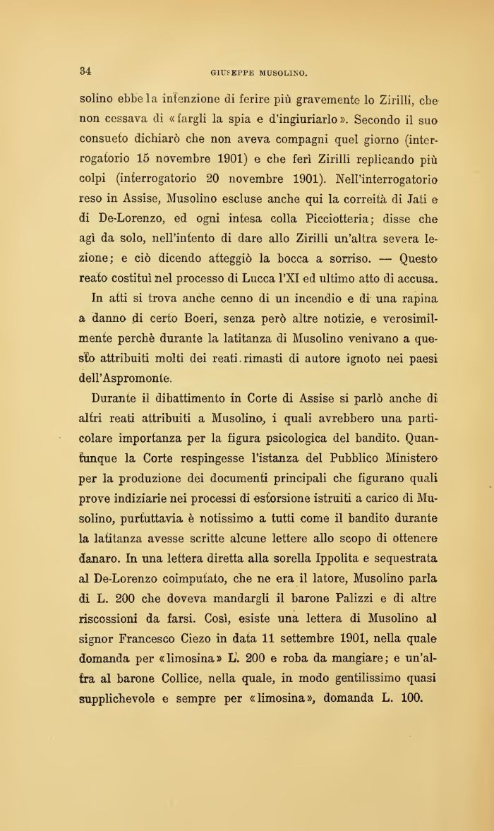 Durante il dibattimento in Corte di Assise si parlò anche dì altri reati attribuiti a Musolino> i quali avrebbero una particolare importanza per la figura psicologica del bandito. Quantunque la Corte respingesse l'istanza del Pubblico Ministero per la produzione dei documenti principali che figurano quali prove indiziarie nei processi di estorsione istruiti a carico di Musolino, purfuttavia è notissimo a tutti come il bandito durante la latitanza avesse scritte alcune lettere allo scopo di ottenere danaro. In una lettera diretta alla sorella Ippolita e sequestrata al De-Lorenzo coimputato, che ne era il latore, Musolino parla di L. 200 che doveva mandargli il barone Palizzi e di altre riscossioni da farsi. Così, esiste una lettera di Musolino al signor Francesco Ciezo in data 11 settembre 1901, nella quale domanda per « limosina » L'. 200 e roba da mangiare ; e un'altra al barone Collice, nella quale, in modo gentilissimo quasi supplichevole e sempre per «limosina», domanda L. 100.