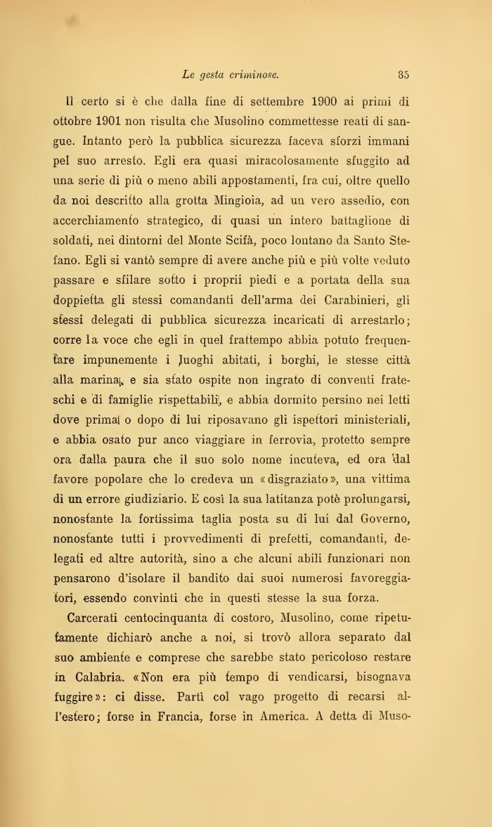 Carcerati centocinquanta di costoro, Musolino, come ripetutamente dichiarò anche a noi, si trovò allora separato dal suo ambiente e comprese che sarebbe stato pericoloso restare in Calabria. «Non era più tempo di vendicarsi, bisognava fuggire » : ci disse. Partì col vago progetto di recarsi all'estero; forse in Francia, forse in America. A detta di Muso-