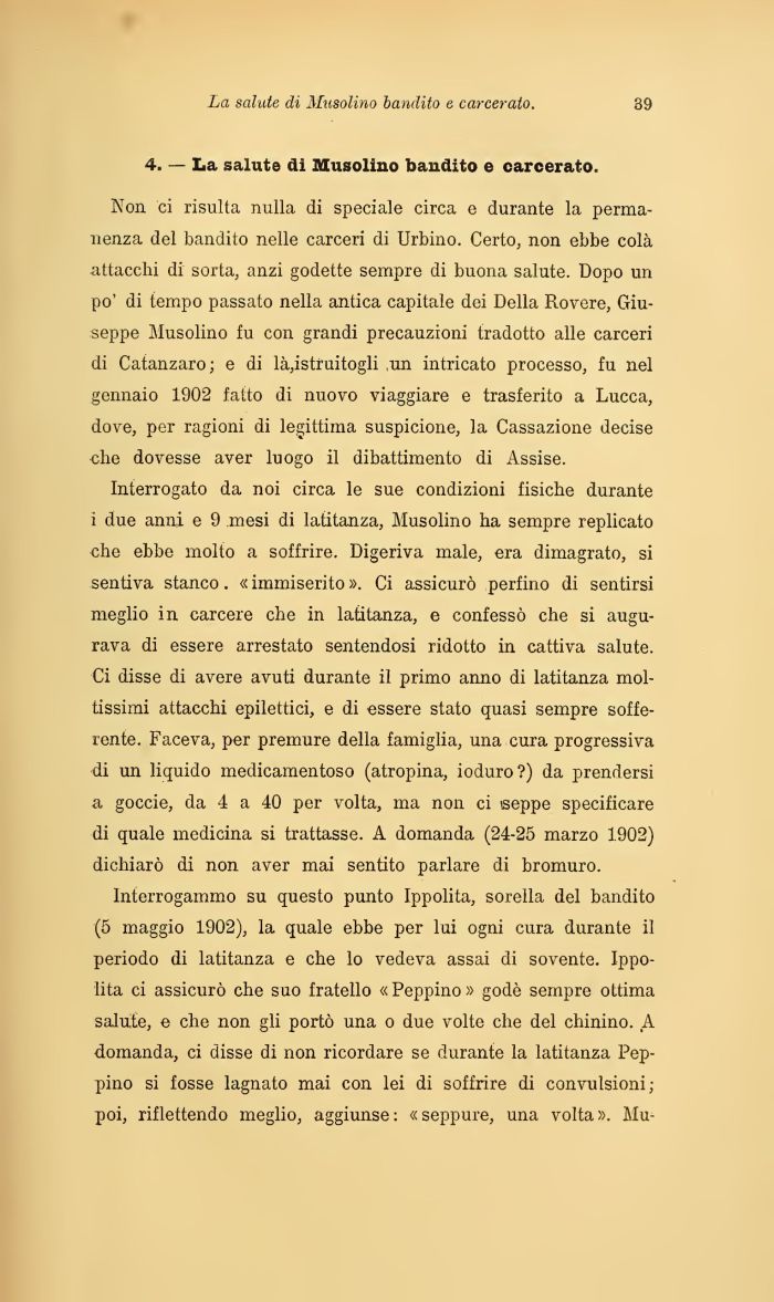 Interrogato da noi circa le sue condizioni fisiche durante i due anni e 9 .mesi di latitanza, Musolino ha sempre replicato ehe ebbe molto a soffrire. Digeriva male, era dimagrato, si sentiva stanco, «immiserito». Ci assicuṛ perfino di sentirsi meglio in carcere che in latitanza, e confesṣ che si augurava di essere arrestato sentendosi ridotto in cattiva salute. Ci disse di avere avuti durante il primo anno di latitanza moltissimi attacchi epilettici, e di essere stato quasi sempre sofferente. Faceva, per premure della famiglia, una cura progressiva di un liquido medicamentoso (atropina, ioduro?) da prendersi a goccie, da 4 a 40 per volta, ma non ci seppe specificare di quale medicina si trattasse. A domanda (24-25 marzo 1902) dichiaṛ di non aver mai sentito parlare di bromuro.