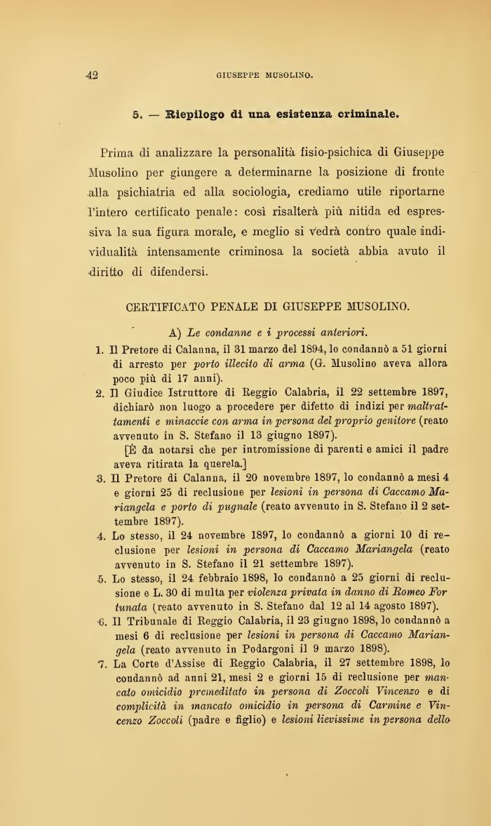Prima di analizzare la personalità fisio-psichica di Giuseppe Musolino per giungere a determinarne la posizione di fronte alla psichiatria ed alla sociologia, crediamo utile riportarne l'intero certificato penale: così risalterà più nitida ed espressiva la sua figura morale, e meglio si Vedrà contro quale individualità intensamente criminosa la società abbia avuto il •diritto di difendersi.