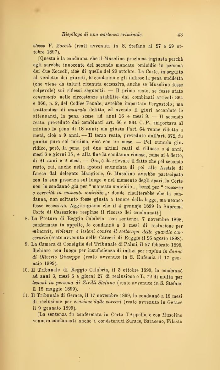 11. Il Tribunale di Gerace, il 17 novembre 1899, lo condannò a 18 mesi di reclusione per evasione dalle carceri (reato avvenuto in Gerace il 9 gennaio 1899).
