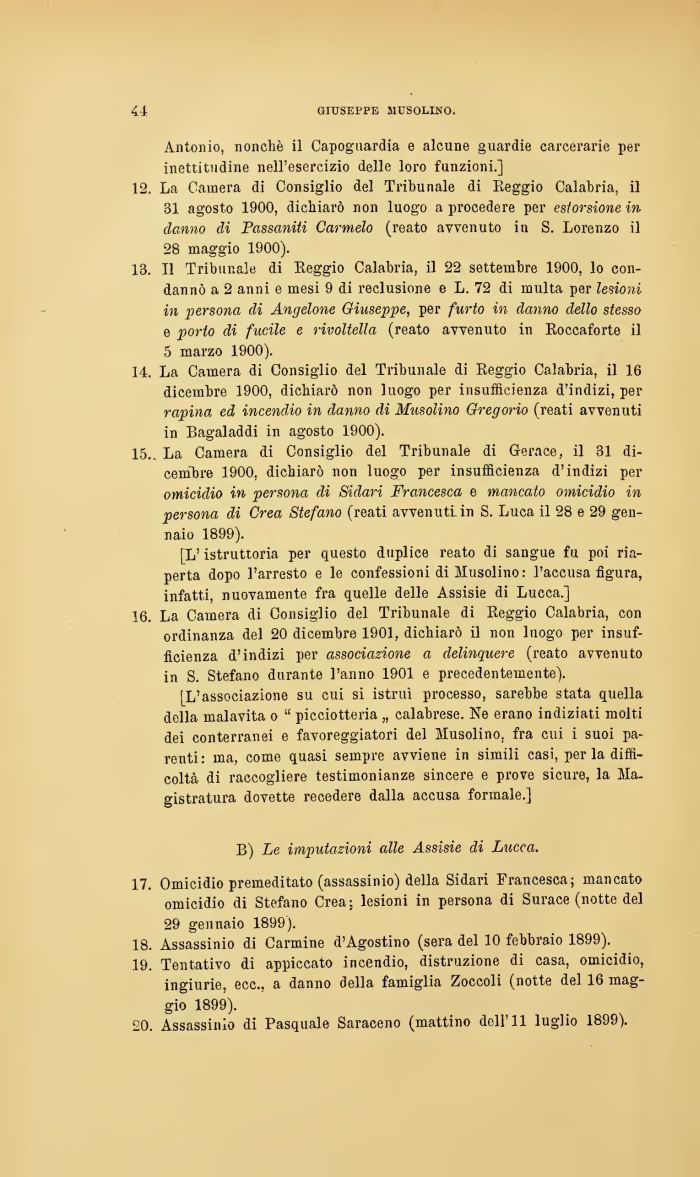 14. La Camera di Consiglio del Tribunale di Reggio Calabria, il 16 dicembre 1900, dichiarò non luogo per insufficienza d'indizi, per rapina ed incendio in danno di Musolino Gregorio (reati avvenuti in Bagaladdi in agosto 1900).