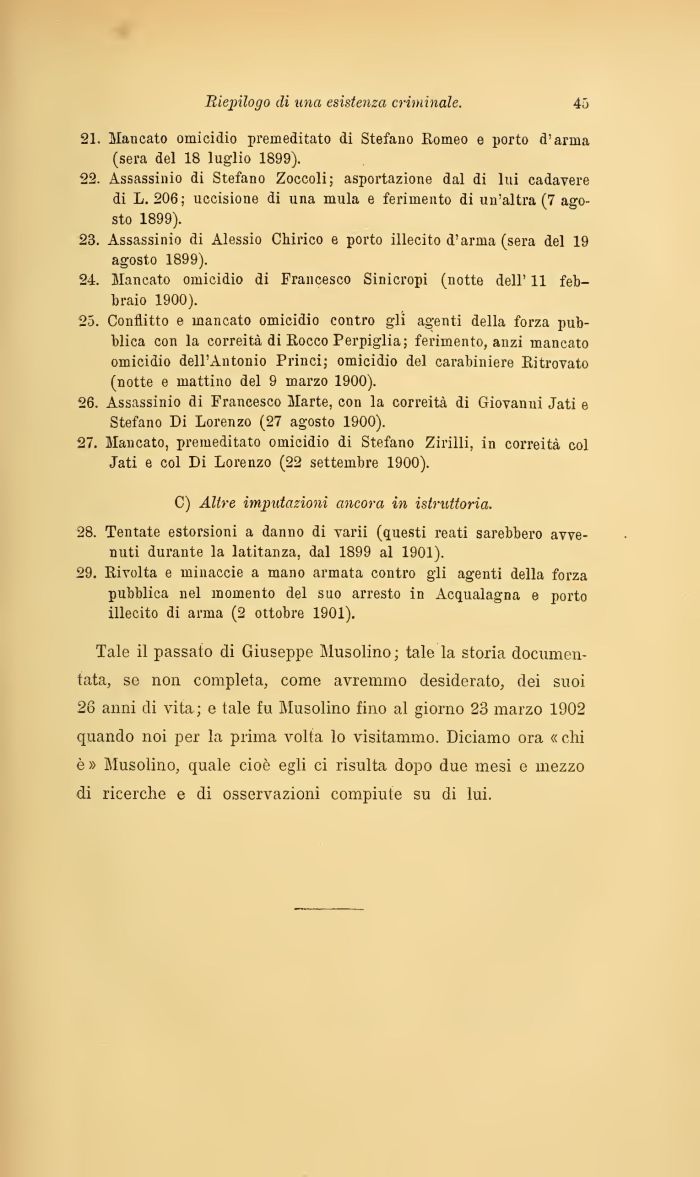 Tale il passato di Giuseppe Musolino; tale la storia documentata, se non completa, come avremmo desiderato, dei suoi 26 anni di vita.; e tale fu Musolino fino al giorno 23 marzo 1902 quando noi per la prima volta lo visitammo. Diciamo ora «chi è » Musolino, quale cioè egli ci risulta dopo due mesi e mezzo dì ricerche e di osservazioni compiute su di lui.