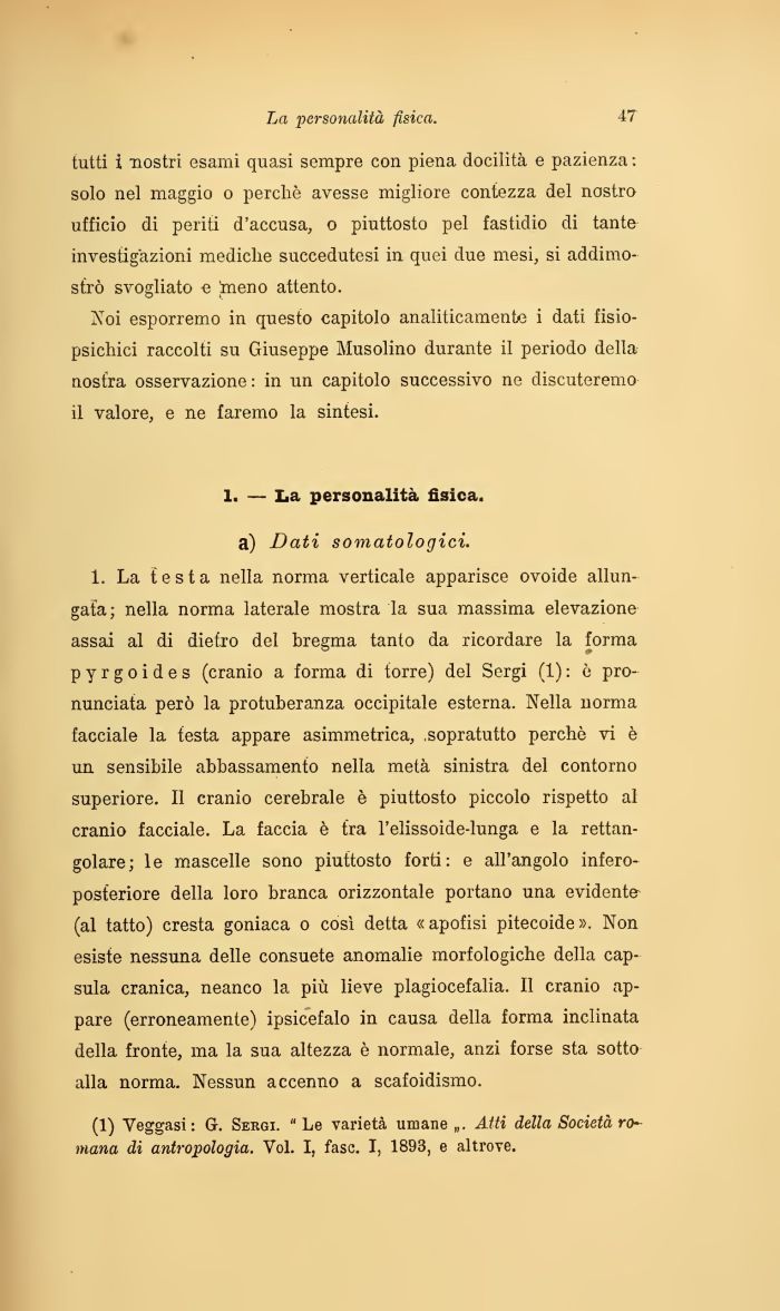 Noi esporremo in questo capitolo analiticamente i dati fisiopsichici raccolti su Giuseppe Musolino durante il periodo della nostra osservazione : in un capitolo successivo ne discuteremo il valore, e ne faremo la sintesi.
