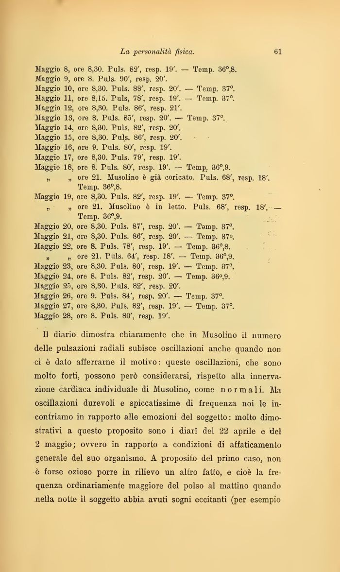 Il diario dimostra chiaramente che in Musolino il numero delle pulsazioni radiali subisce oscillazioni anche quando non ci è dato afferrarne il motivo : queste oscillazioni, che sono molto forti, possono però considerarsi, rispetto alla innervazione cardiaca individuale di Musolino, come normali. Ma oscillazioni durevoli e spiccatissime di frequenza noi le incontriamo in rapporto alle emozioni del soggetto: molto dimostrativi a questo proposito sono i diari del 22 aprile e del 2 maggio; ovvero in rapporto a condizioni di affaticamento generale del suo organismo. A proposito del primo caso, non è forse ozioso porre in rilievo un altro fatto, e cioè la frequenza ordinariamente maggiore del polso al mattino quando nella notte il soggetto abbia avuti sogni eccitanti (per esempio