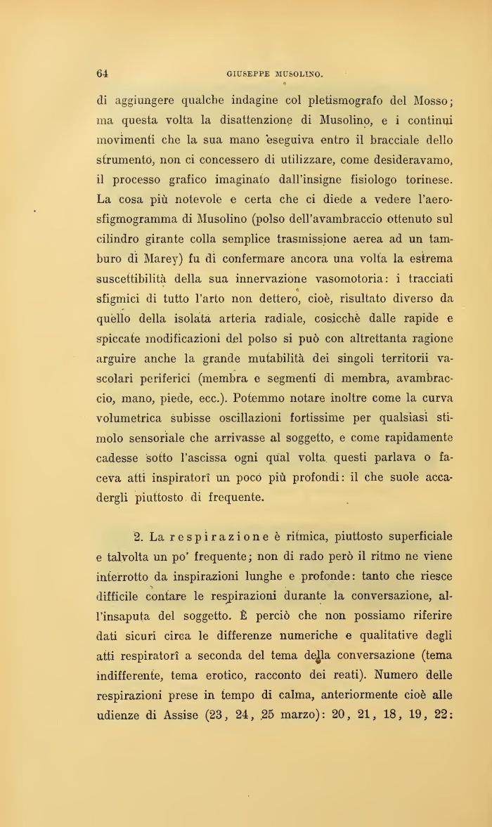 di aggiungere qualche indagine col pletismografo del Mosso; ma questa volta la disattenzione di Musolino, e i continui movimenti che la sua mano eseguiva entro il bracciale dello strumento, non ci concessero di utilizzare, come desideravamo, il processo grafico invaginato dall'insigne fisiologo torinese. La cosa più notevole e certa che ci diede a vedere l'aero-sfigmogramma di Musolino (polso dell'avambraccio ottenuto sul cilindro girante colla semplice trasmissione aerea ad un tamburo di Marey) fu di confermare ancora una volta la estrema suscettibilità della sua innervazione vasomotoria: i tracciati sfigmici di tutto l'arto non dettero, cioè, risultato diverso da quello della isolata arteria radiale, cosicché dalle rapide e spiccate modificazioni del polso si può con altrettanta ragione arguire anche la grande mutabilità dei singoli territorii vascolari periferici (membra e segmenti di membra, avambraccio, mano, piede, ecc.). Potemmo notare inoltre come la curva volumetrica subisse oscillazioni fortissime per qualsiasi stimolo sensoriale che arrivasse al soggetto, e come rapidamente cadesse sotto l'ascissa ogni qual volta, questi parlava o faceva atti inspiratori un poco più profondi: il che suole acca-dergli piuttosto di frequente.