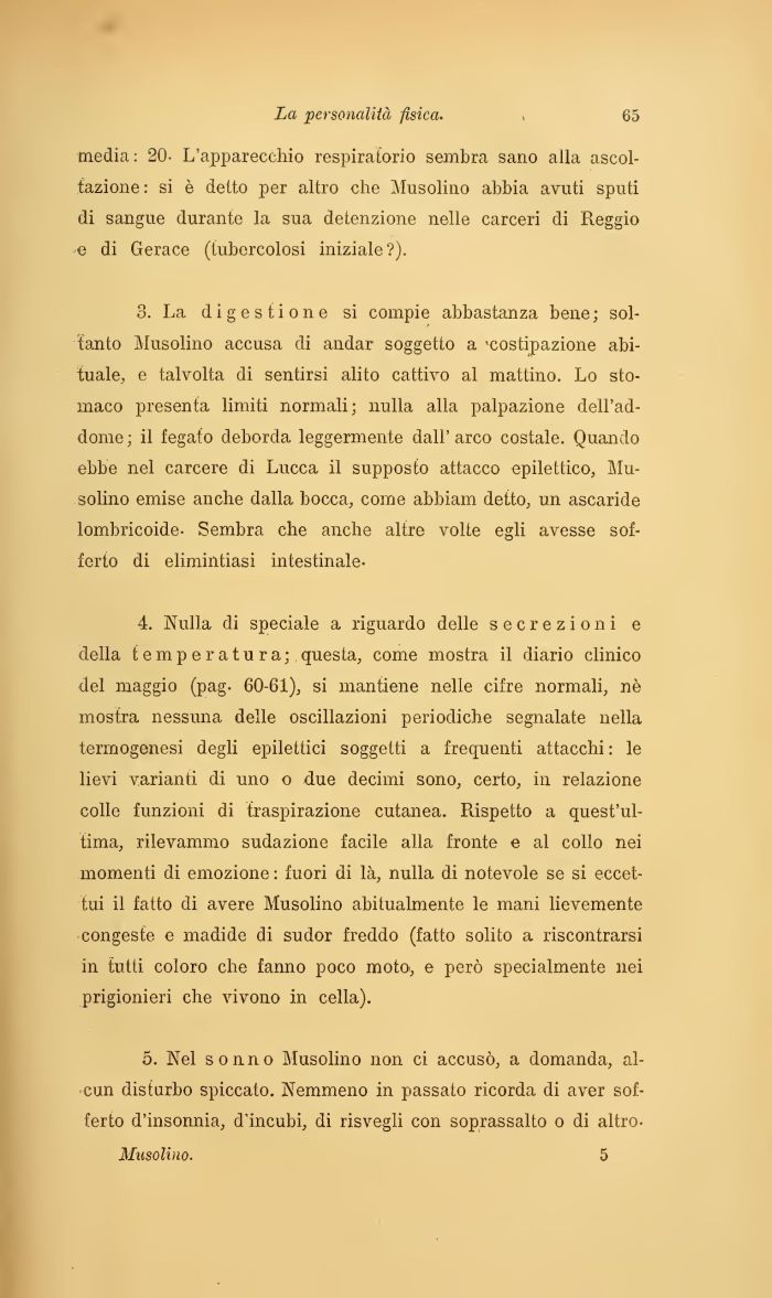 o. Nel sonno Musolino non ci accuṣ, a domanda, alcun disturbo spiccato. Nemmeno in passato ricorda di aver sofferto d'insonnia, d'incubi, di risvegli con soprassalto o di altro-Musolino. 5