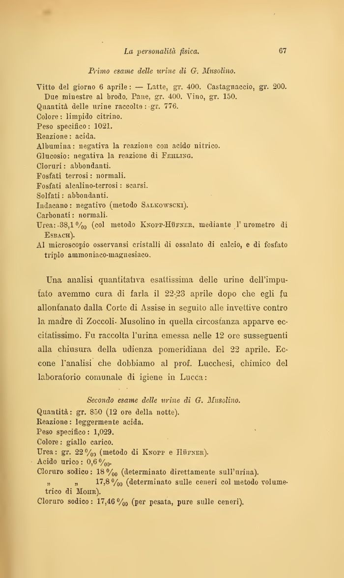 Una analisi quantitativa esattissima delle urine dell'imputato avemmo cura di farla il 22-23 aprile dopo clie egli fu allontanato dalla Corte di Assise in seguito alle invettive contro la madre di Zoccoli- Musolino in quella circostanza apparve eccitatissimo. Fu raccolta l'urina emessa nelle 12 ore susseguenti alla chiusura della udienza pomeridiana del 22 aprile. Eccone l'analisi che dobbiamo al prof. Lucchesi, chimico del laboratorio comunale di igiene in Lucca: