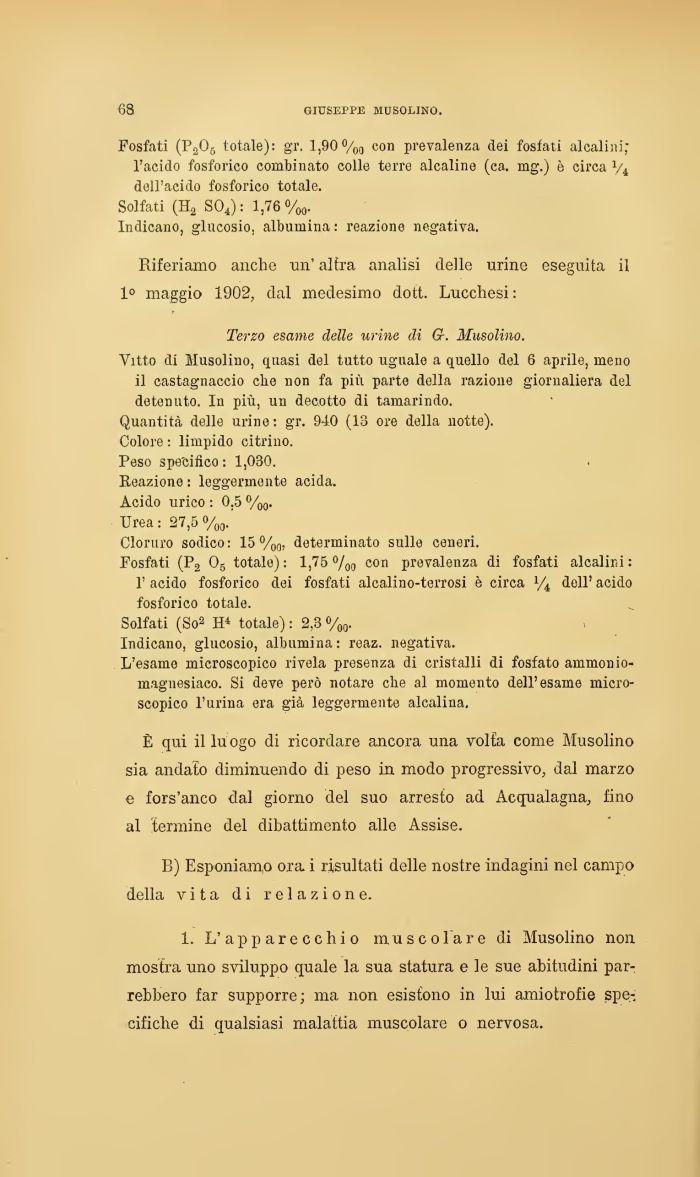 Terzo esame delle urine di G-. Musolino. Vitto di Musolino, quasi del tutto uguale a quello del 6 aprile, meno il castagnaccio che non fa più. parte della razione giornaliera del detenuto. In più, un decotto di tamarindo. Quantità delle urine: gr. 940 (13 ore della notte). Colore : limpido citrino. Peso specifico : 1,030. Reazione : leggermente acida. Acido urico : 0.5 %0. Urea: 27,6%,.'