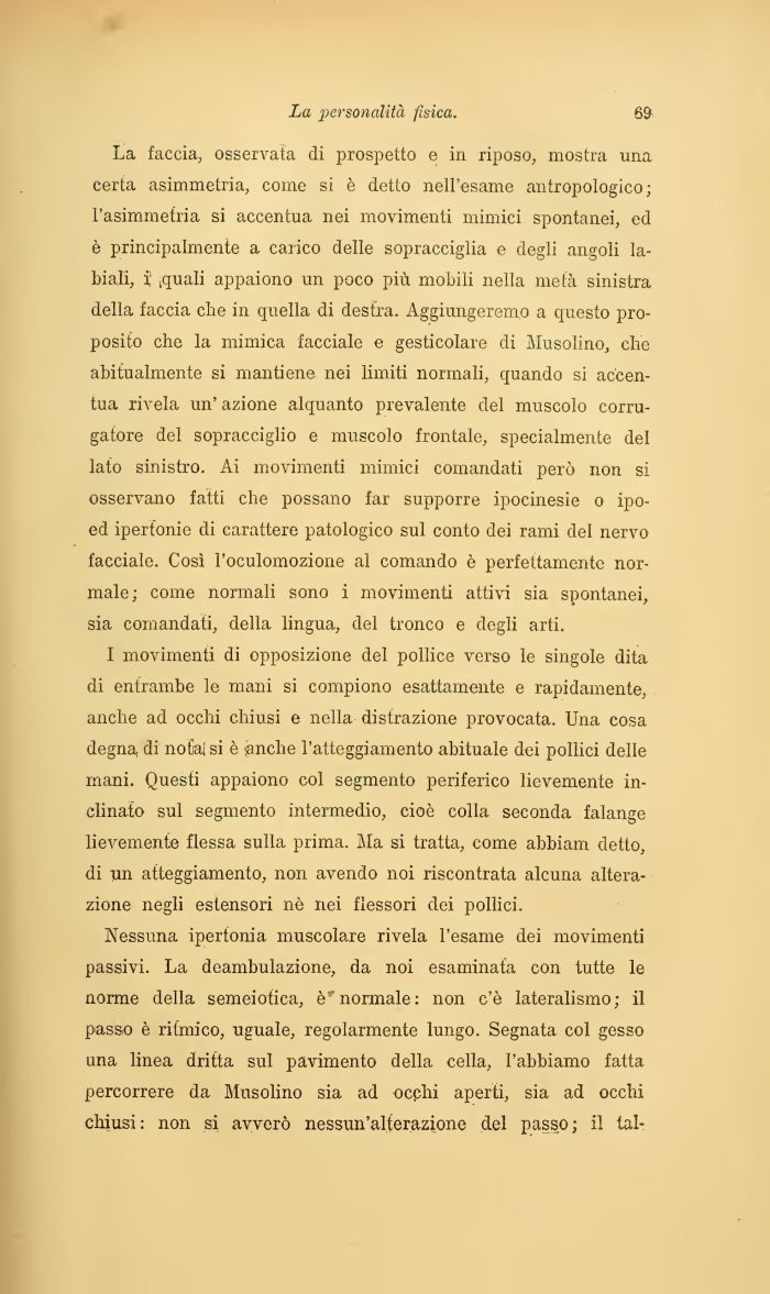 Nessuna ipertonia muscolare rivela l'esame dei movimenti passivi. La deambulazione, da noi esaminata con tutte le norme della semeiotica, è'normale: non c'è lateralismo; il passo è ritmico, uguale, regolarmente lungo. Segnata col gesso una linea dritta sul pavimento della cella, l'abbiamo fatta percorrere da Musolino sia ad ocphi aperti, sia ad occhi chiusi: non si avverò nessun'alterazione del passo; il tal-