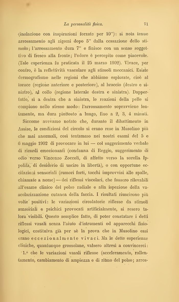 Siccome avevamo notato che, durante il dibattimento in Assise, le condizioni del circolo si erano rese in Musolino più che mai anormali, così tentammo nei nostri esami del 5 e 6 maggio 1902 di provocare in lui — col suggerimento verbale di ricordi emozionanti (condanna di Roggio, suggeriménto di odio ' verso Vincenzo Zoccoli, di affetto verso la sorella Ippolita, di desiderio di uscire in libertà), o con opportune eccitazioni sensoriali (rumori forti, tocchi improvvisi alle spalle, chiamate a nome) — dei riflessi viscolari, che fossero rilevabili all'esame clinico del polso radiale e alla ispezione della vascolarizzazione cutanea della faccia. I risultati riuscirono più volte'positivi : le variazioni circolatorie riflesse da stimoli sensoriali e psichici provocati artificialmente, si resero ta-lora'visibili. Questo semplice fatto, di poter constatare i detti riflessi vasali senza l'aiuto d'istrumenti od apparecchi fisiologici, costituiva già per sè la prova che in Musolino essi erano eccezionalmente vivaci. Ma le dette esperienze cliniche, quantunque grossolane, valsero altresì a convincerci: